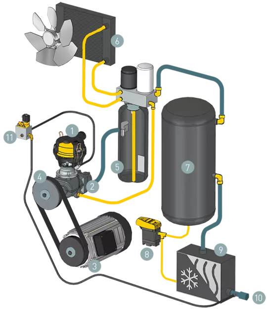 Das Kühlsystem arbeitet mit einem neuartigen zweiflutigem Lüfter (zum Patent angemeldet). Seine Formgestaltung sorgt für hohe Wirksamkeit und verringert die Geräuschentwicklung. Die separate Führung der zu verdichtenden Luft sowie der eintretenden Kühlluft für Luft/-Fluidkühler und Motor bringt Reserven auch bei hohen Umgebungstemperaturen bis 45 °C. Das Ansaugen der Motorkühlluft und der zu verdichtenden Luft direkt aus der Umgebung sichert hochwirksame Motorkühlung und steigert die Effizienz der Verdichtung. Die mit niedrigen Strömungsgeschwindigkeiten arbeitende Kühlluftführung minimiert die Geräuschentwicklung.